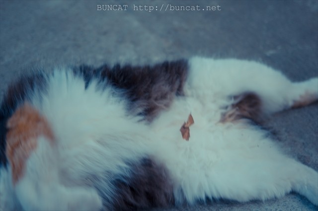先日も、おなかに枯れ葉を絡めていた。