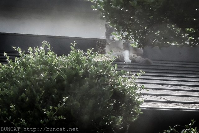 屋根でメンテナンス中の灰白氏は、当方のカメラに気付いて